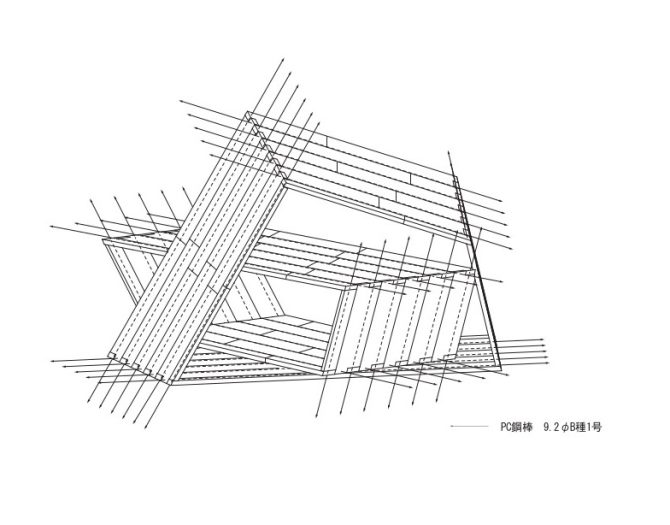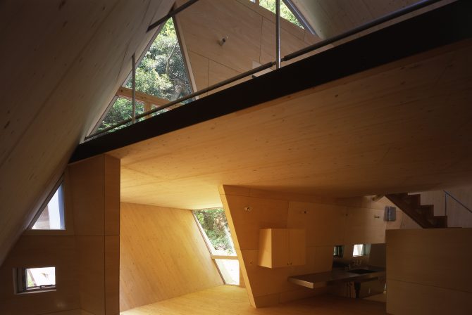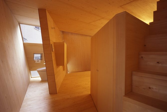 面=構造であり熱環境装置(断熱材)であり、仕上げ材として湿気や空気を出し入れすることで人間の体にも優しい点や、木造でありながら、柱と梁による構成ではなく、面で構成することを考えつき、木パネルでできた2つのリング状の空間を組み合わせ、さらにヒネリを加える事ですべての壁が斜めになりました。この構成によって、様々な方向へ広がる空間の多様性が生まれ、3次元的で豊かな生活空間が生まれました。さらに視線が乱反射することにより、垂直・水平を基本とする人間の空間認知特性との間にズレが生じ、ある種の不協和音が起こります。しかし、木という素材にはその違和感を低減させる独特の質感があります。木パネルは構造材でもあり、さらに断熱・調湿の機能を持つため、ムダな仕上げはせず、木肌をそのまま活かした内装仕上げになっています。