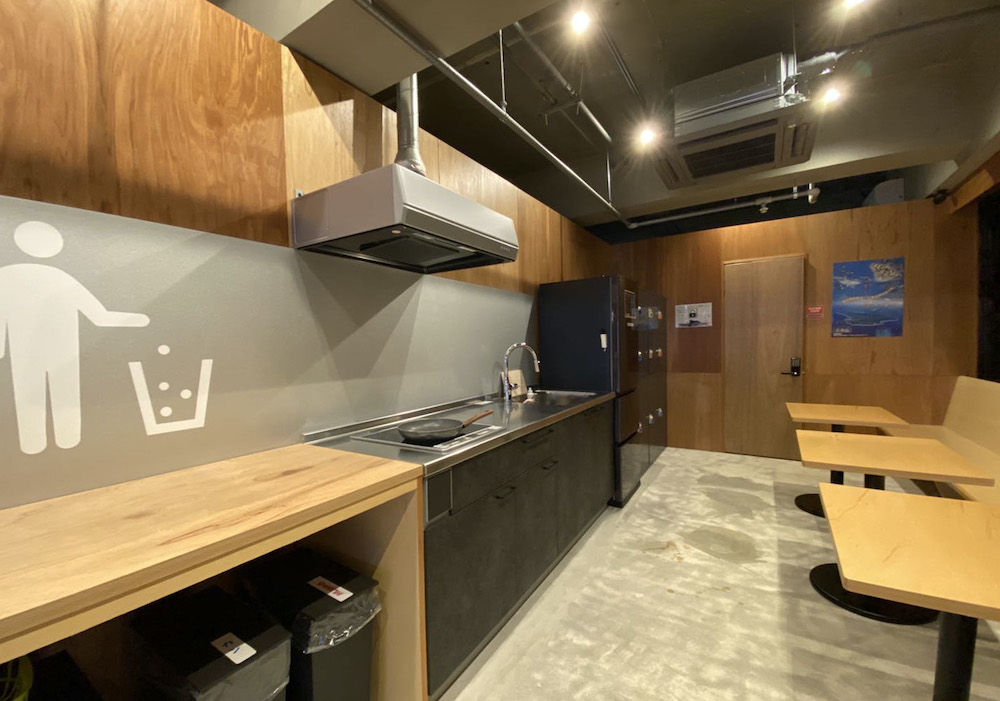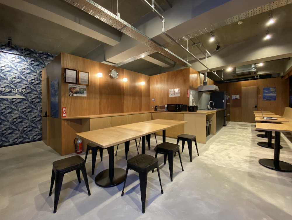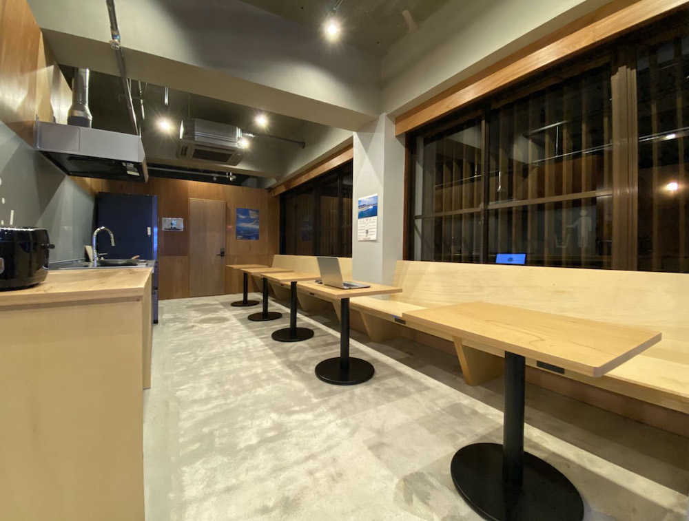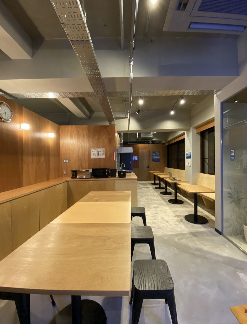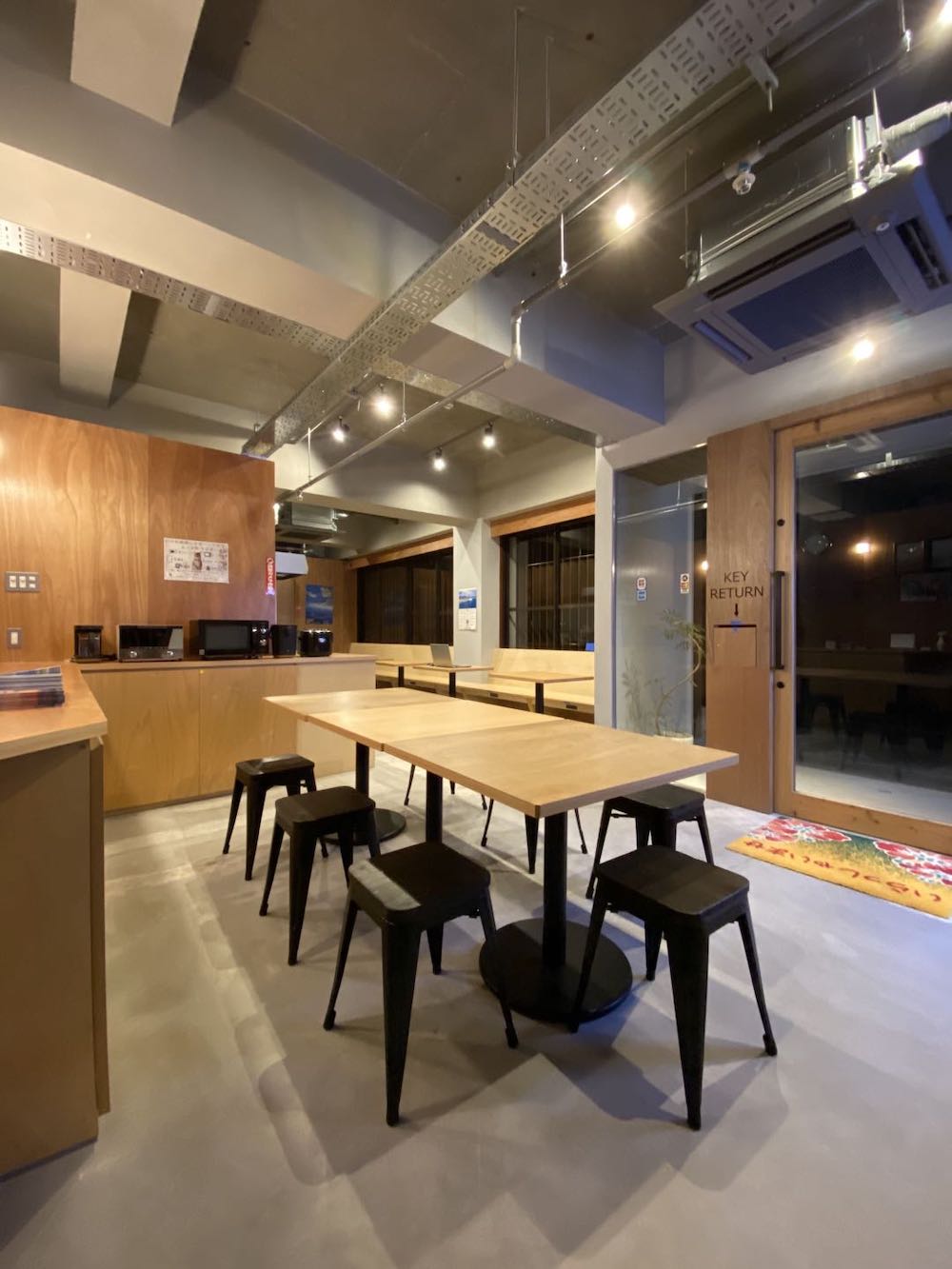 面積の約半分を宿泊者が調理や食事ができる共用部として、周辺の住民も自由に使えるラウンジとした。