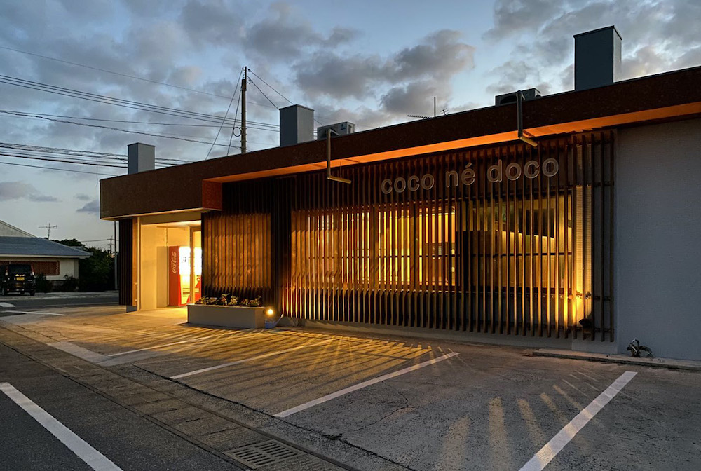 外装には国産の杉材(?)を特殊アルコール樹脂処理により30年以上の耐久性を持たせた材料でルーバーを作り、共用部に入り込む強い西日を防ぐと同時に夜は賑わいを程よく街ににじませる効果を担っている。。